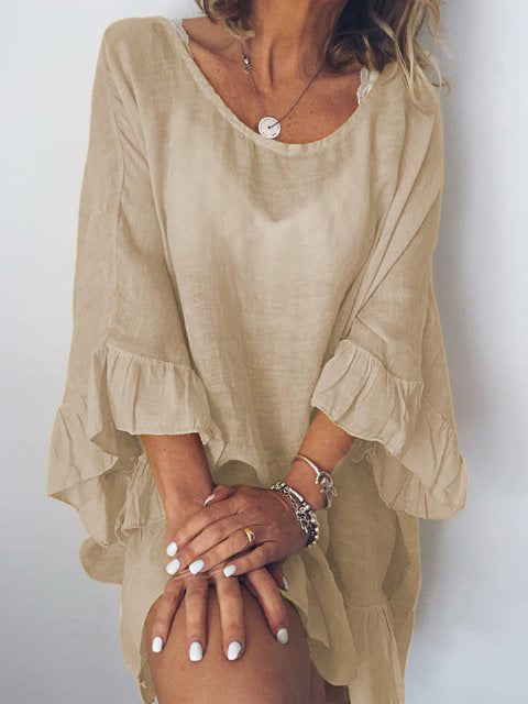 שמלת מידי רפויה עם ראפלס בצבע אחיד, מושלמת לכל עונה ולשימוש יומיומי. עם מחשוף עגול ושרוול 3/4, השמלה עשויה מכותנה ופשתן לנוחות מרבית. מתאימה לכל הזדמנות ומשלבת סגנון קז'ואל ואופנתי.